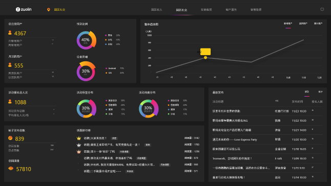 實時掌握用戶動態(tài),描繪用戶畫像園區(qū)注冊用戶、活躍用戶、帖子數(shù)、活動參與情況等
